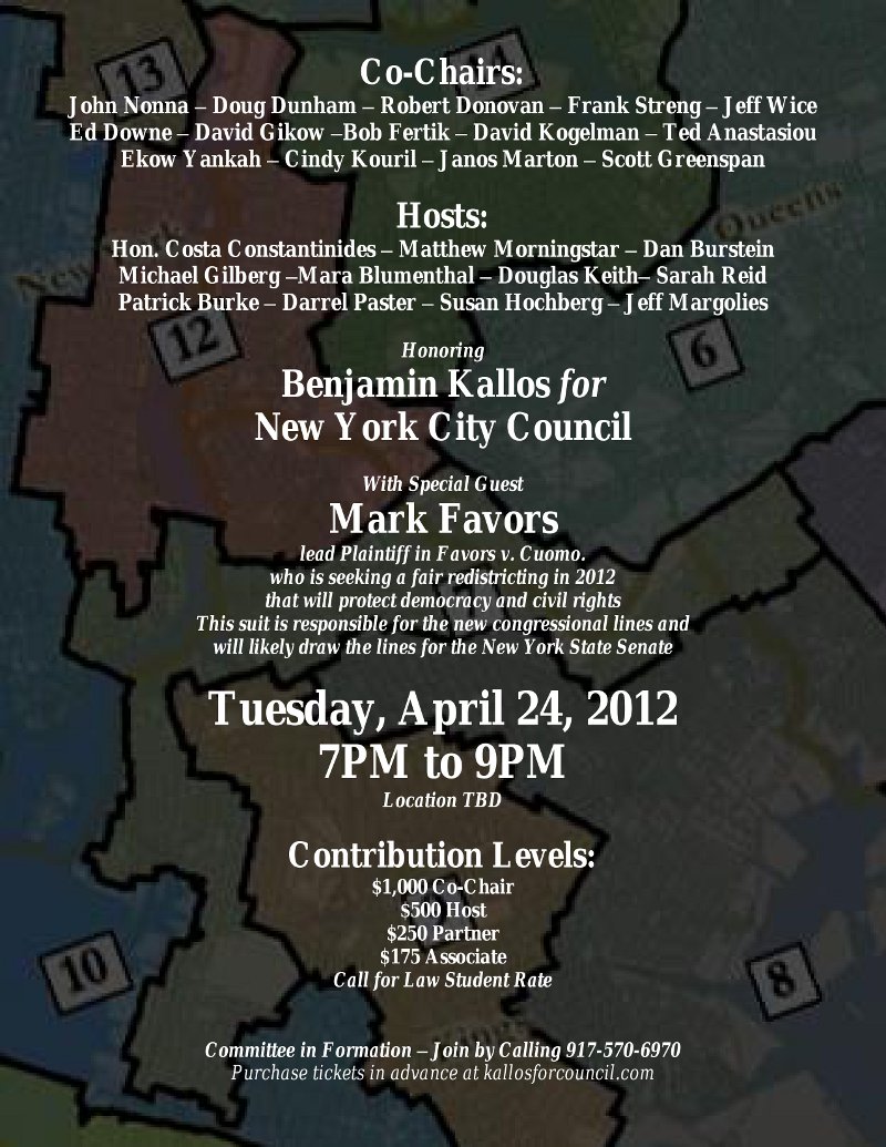 I’m not sure that I’ve ever seen a campaign fundraiser themed quite like this before, but New York City Council candidate Ben Kallos is holding a fundraiser (donation for co-chairs, $1,000) centered around a discussion of the redistricting lawsuit Cuomo v. Favors.