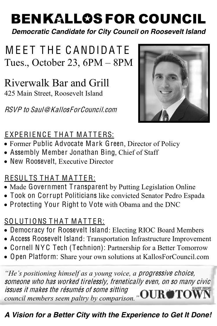 Democratic Party NY City Council Candidate Ben Kallos invites Roosevelt Island residents to join him on Tuesday October 23 from 6-8 PM at the Riverwalk Bar & Grill. It's an opportunity to meet and discuss important issues facing Roosevelt Island and NYC with Mr. Kallos who hopes to succeed our current NYC Council Member Jessica Lappin as she is expected to run for Manhattan Borough President.