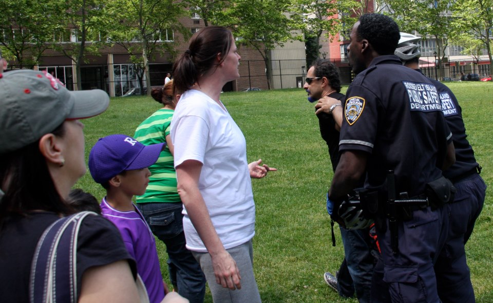 Once the first game ended, I sat with my son during the first three innings of the second game, but left to prepare a picnic for my family and some friends. As I was leaving for the picnic, Karine Wong, whose son was playing in the second game, called to informe me that the game was cut short before the end of the last inning by Public Safety. They were brought in by offisland teams after a confrontation with a Roosevelt Island parent. The Little League’s permit from RIOC ended at 1:00 and it was now 1:45 p.m. I went out to the field with my camera to document the incident.