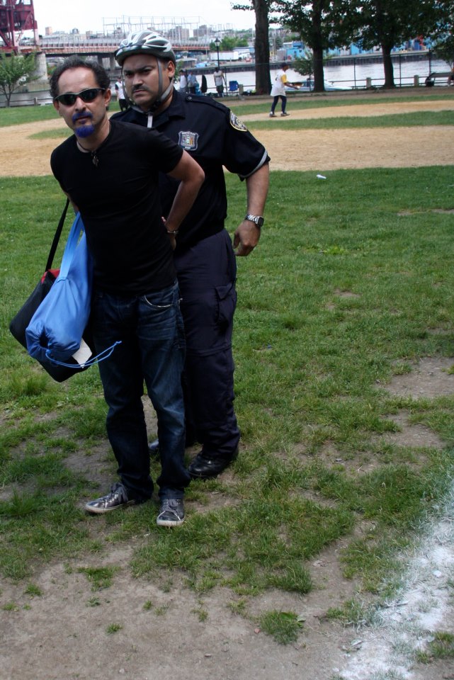 Upon their arrival, I stopped to take a picture of the officer dismounting his bike –officer Wilson Toro- who walked towards the crowd and, directing his words to me, he said, “leave the field”. He then came closer to me and, louder, said, “I told you to leave the field,” to which I responded, “Not before I take this last picture of the kids being forced out of the field in this manner” –perhaps I should have phrased it better to avoid any misunderstanding of my peaceful intentions- and proceeded in taking his picture as well as the Roosevelt Island parents and children in the immediate background. Officer Toro then pushed me, in my ribs, saying, “I give you 10 seconds to leave.” I turned, in pain, and said, “Don’t touch me.” He responded, “You don’t want me to touch you? I’ll show you what that means.” He dangled his handcuffs in front of my face. He twisted my arms to the back and locked the andcuffs very tight on my wrists. I handed my digital camera to Peter Alber (Green team coach) and asked him to continue documenting the events. Meanwhile, Officer Toro was saying: “I’ll teach you a lesson.”
