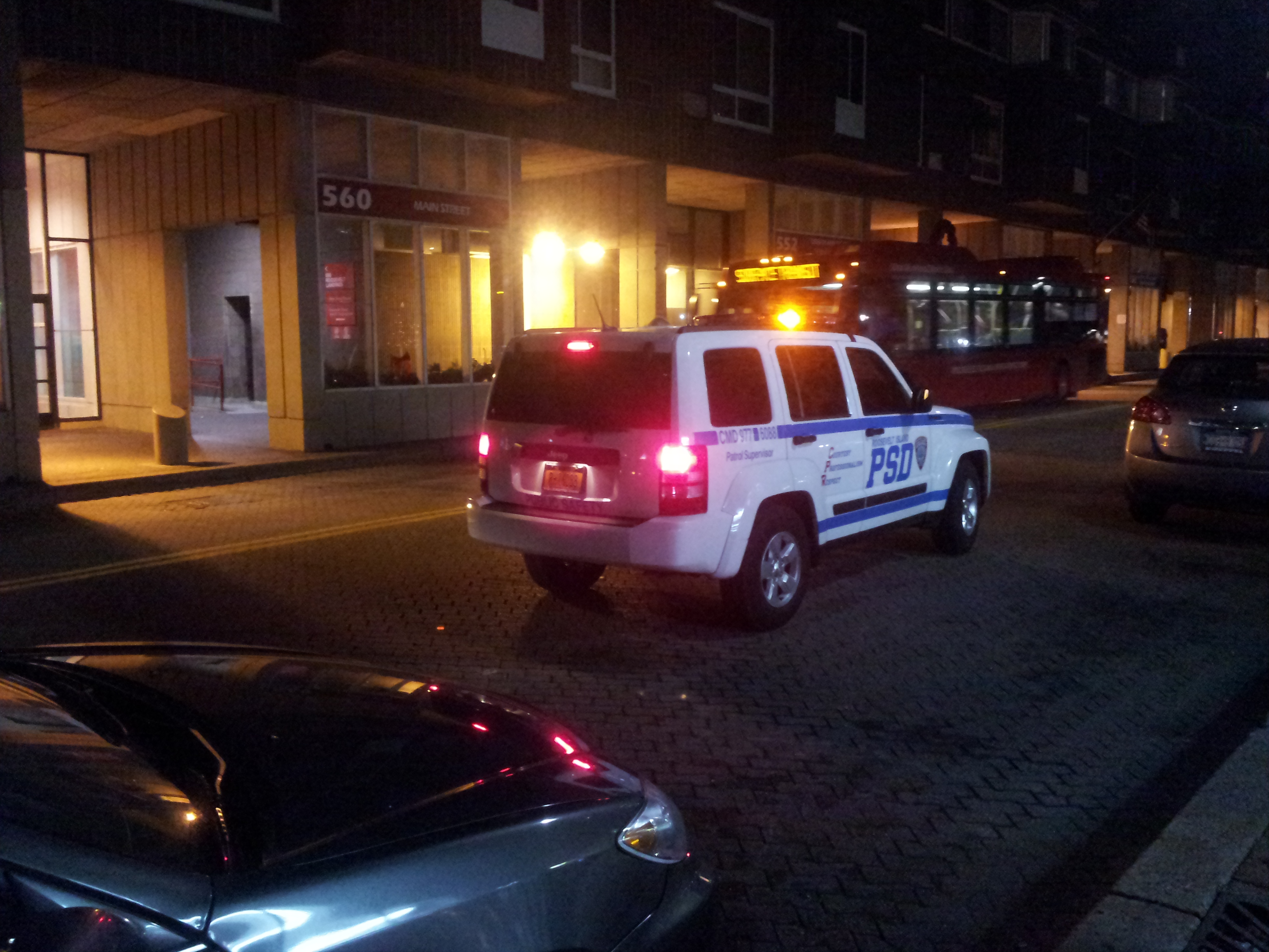 When I reached the sidewalk, there were two uniformed employees of RIOC's Public Safety Department running around my car, which was still going, with the lights still on. They had pulled their marked vehicle alongside my car, perhaps ten inches from the driver's door. This had the dual effects both of making it almost impossible to re-enter my car, as well as completely closing off River Road's southbound one-way fork in front of 20 River Road. River Road remained blocked to all traffic for at least the next half hour.
